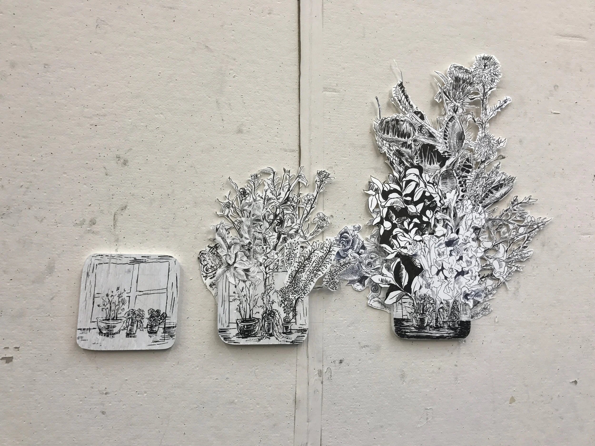 Made with paper, gouache, acrylic paint, burlap, canvas.